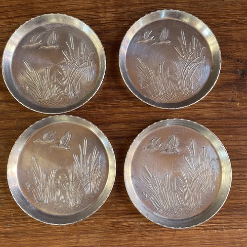 4 Vintage Aluminum Coasters Ducks Mallards Cattails Metal Barware