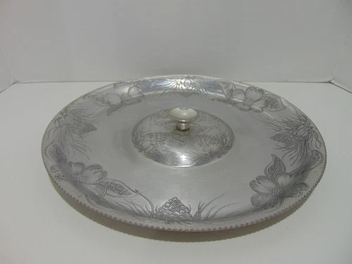 Embossed Aluminum Round Serving Platter Plate Floral Pattern With Carrying Knob