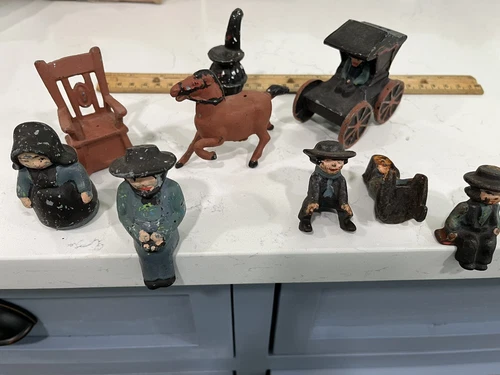 Vintage Cast Iron Amish Figurines Man Woman Boy Girl Horse Buggy Chair Stove 9pc