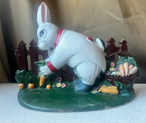 Cast Iron Bunny Door Stop With Fence Carrots Basket Hand-Painted Vintage Easter