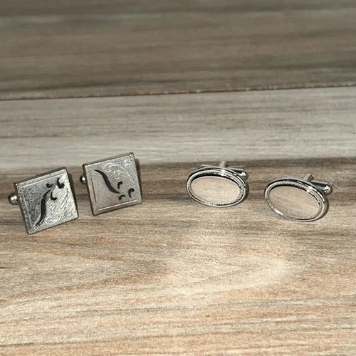 Vintage Retro Cufflink Lot Men’s Silver Tone Square Etched Oval Polished Classic