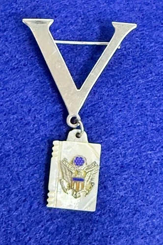Vintage WWII Sterling Silver V for Victory Pin Mother of Pearl Book Charm 1940s