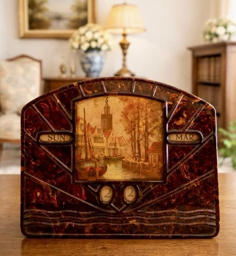 Vintage Art Deco Perpetual Desk Calendar Tortoise Shell Look Harbor Scene Decor