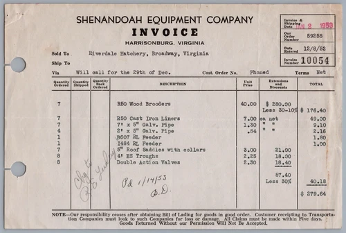 1953 Harrisonburg, Virginia Shenandoah Equipment Company Invoice Ephemera