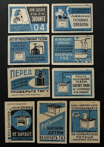 Travelstamps: 1961 Russia Matchbox Labels - Gas Appliance Safety - Set of 9