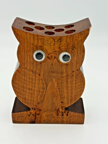 Hand Carved Wooden Owl Holder Rustic Folk Art Desk Organizer Pen Holder