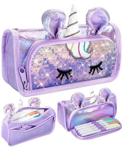 LISEVO 3D Sparkly Pencil Case Purple Cute Sequin Pencil Pouch Girls Kids