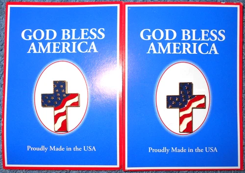 2 - GOD BLESS AMERICA PATRIOTIC AMERICAN FLAG CROSS METAL & ENAMEL LAPEL PINS