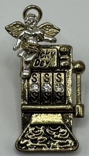 Lucky Day Slot Machine Pin Angel Rhinestone Gold Tone Vintage Charm