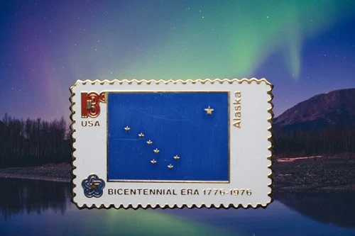 Alaska Pin Bicentennial Era 13 cent stamp style pin with Alaska state Flag 1976