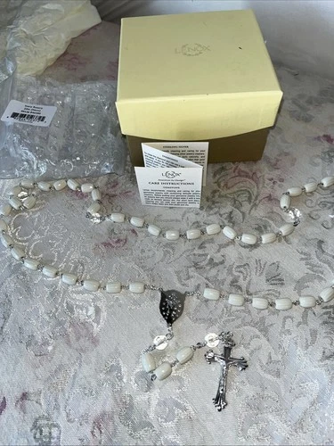 Lenox Silver Ivory Porcelain Rosary 925 Silver Crucifix/Medallion 22” New