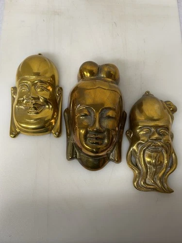 Set of 3, VTG Solid, Heavy, Brass Buddha Wall Masks. Asian Culture. 5.12lbs