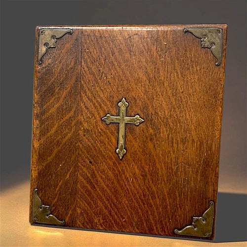 Antique Wooden Communion Box Brass Cross Purple Velvet Lined Church Relic Case