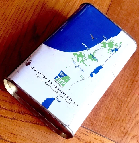 GERMAN Tzedakah KKL JNF Jewish TIN BLUE BOX Judaica ISRAEL MAP Hebrew MONEY BANK