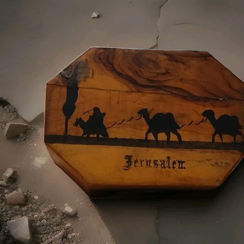 Wooden Octagonal Jerusalem Box with Camel Scene, Red Lined Interior, Mirror