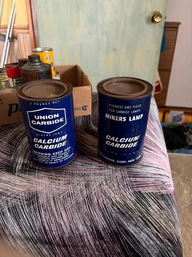 2 vintage union carbide miners lamp 2 pound cans one full other empty. vgv