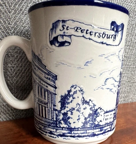 Vintage Saint Petersburg Mug Russian Ministry Gifts Porcelain Blue White 12 Oz