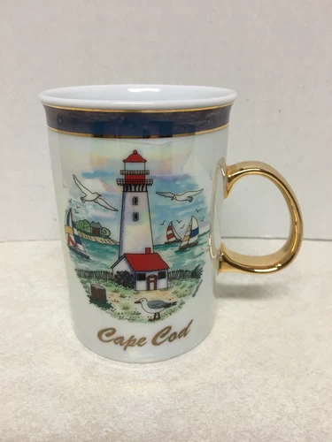 Vintage Cape Cod Souvenir Mug Cup Sailboats Seagull Lighthouse 4"H Gold Handle
