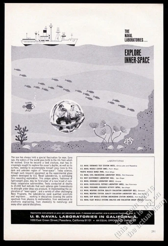 1966 U.S. Navy Naval Laboratories Pasadena CA men in diving bubble print ad