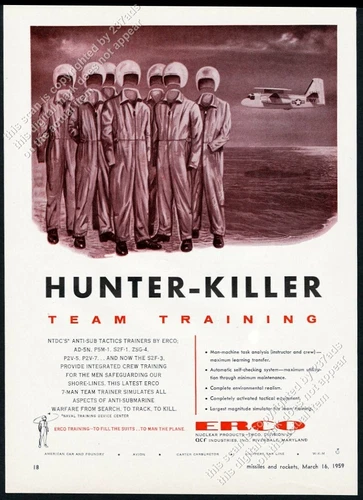 1959 NTDC US Navy submarine hunter killer team art Erco vintage print ad