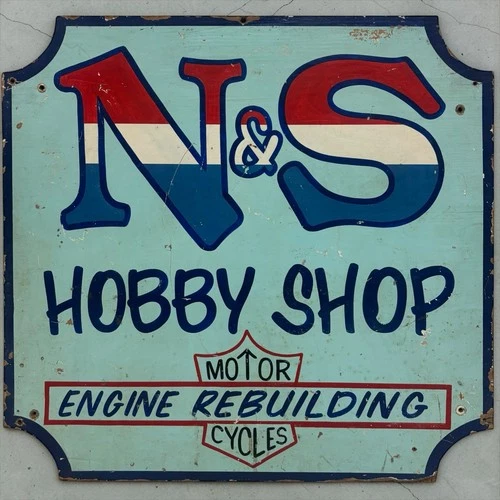 Vintage Harley Davidson Motorcycle Hobby Shop Sign Engine Rebuild Bike Gas Oil