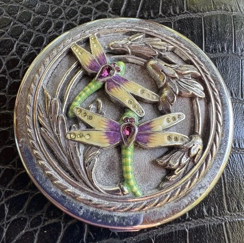 Brighton Mirror Compact Silvertone Enamel Dragonfly Repousse Magnifying Travel