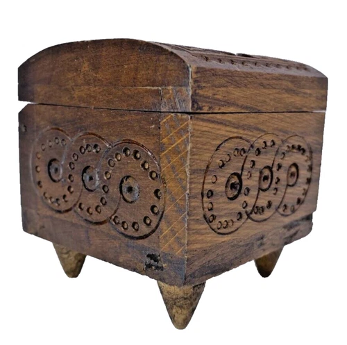 Vintage Hand Carved Wooden Trinket Box Hinged Lid 2.5 in square Footed Intricate