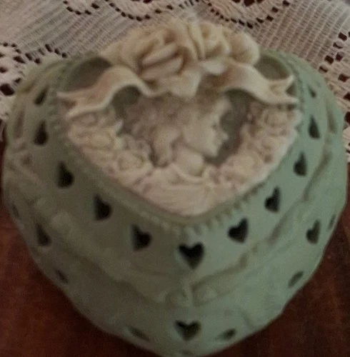 Green Heart-Shaped Trinket Box with Cameo and Floral Design