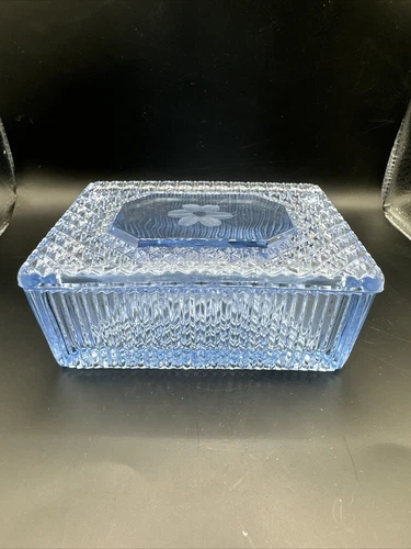 Vintage Pressed Glass Blue Trinket Box See Through Design Lid Etched Flower