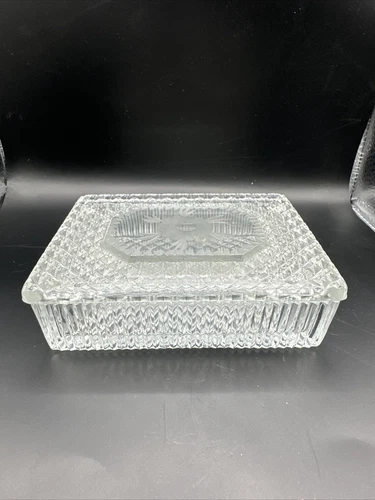 Vintage Pressed Glass Clear Trinket Box See Through Design Lid Etched Flower