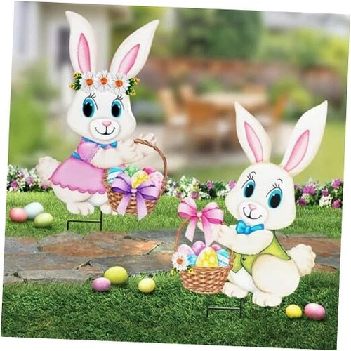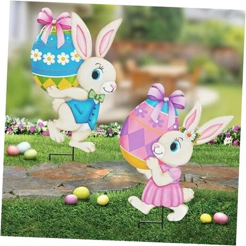 Easter Decorations Outdoor,2 Pack Metal Easter Egg Bunny Yard Signs Bunny-01