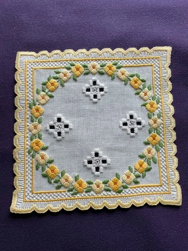 Beautiful Hardanger Doily with Yellow Flowers