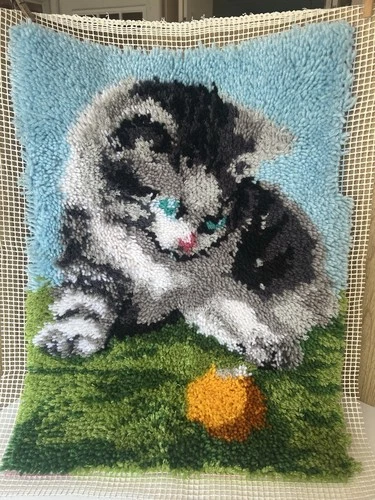 Latch Hook Kitten Rug Finished Wall Hanging 27 x 20 Vintage Handmade