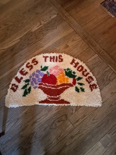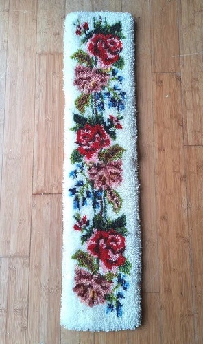 VTG MCM Floral Latch-Hook Shag Carpet Wall Hanging Handmade 39”x 9”