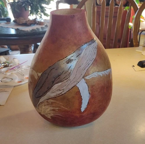 Handmade Brown Gourd Vase with Whale Artwork Decorative Art Piece