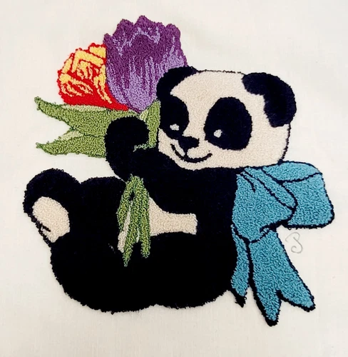 Vintage Needlepoint Punch Panda Tulips 2 Frame or Pillow or On Jacket, etc