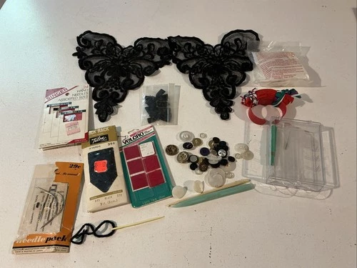 Vintage Sewing Supplies; Needles, Buttons, Black lace, Velcro Other; ES0824