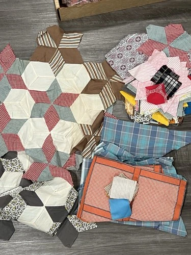 Vintage Quilt Blocks & Fabric Lot 1951 Kansas Handmade Hexagon Sewing Craft