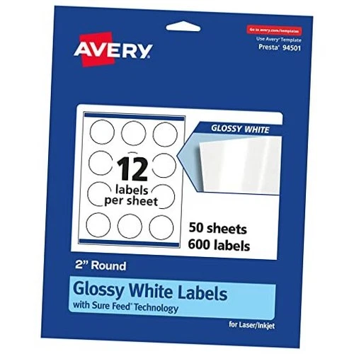 Round Labels, Sure Feed Technology, 2 Inch Diameter (600 Labels) Glossy White