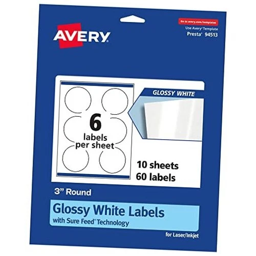 Round Labels, Sure Feed Technology, 3" Diameter, 60 Glossy White 60 labels