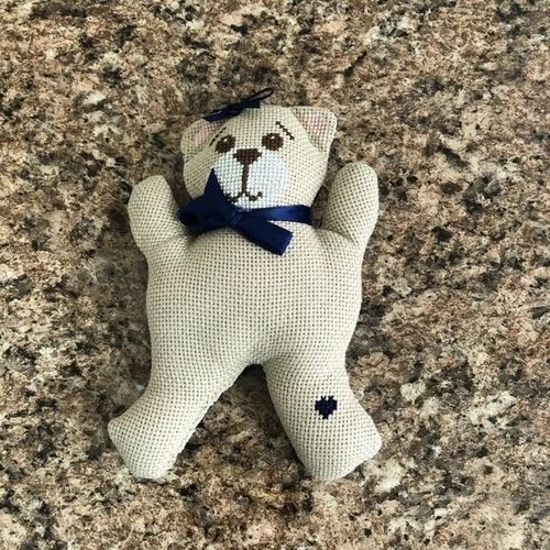 Handmade Cross Stitch Teddy Bear Stuffed Animal Blue Bow Heart Accent Decor