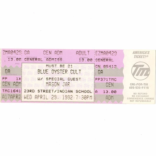 BLUE OYSTER CULT Concert Ticket Stub PHOENIX ARIZONA 4/29/92 MASON JAR GODZILLA!
