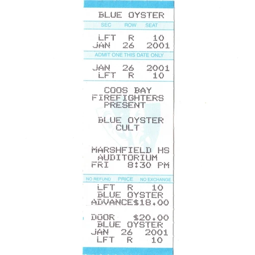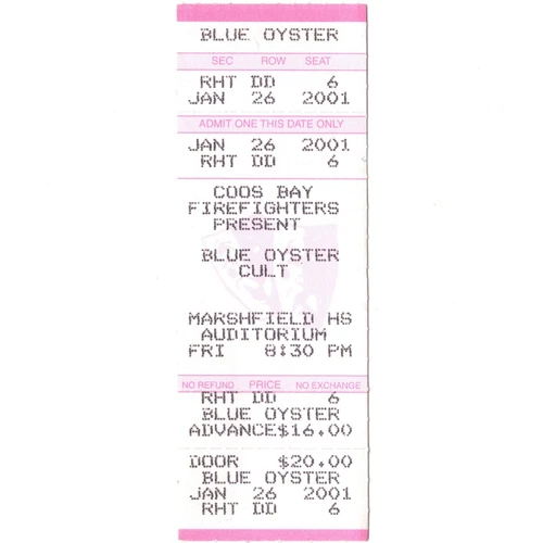 BLUE OYSTER CULT Concert Ticket Stub COOS BAY OR 1/26/01 DONT FEAR THE REAPER