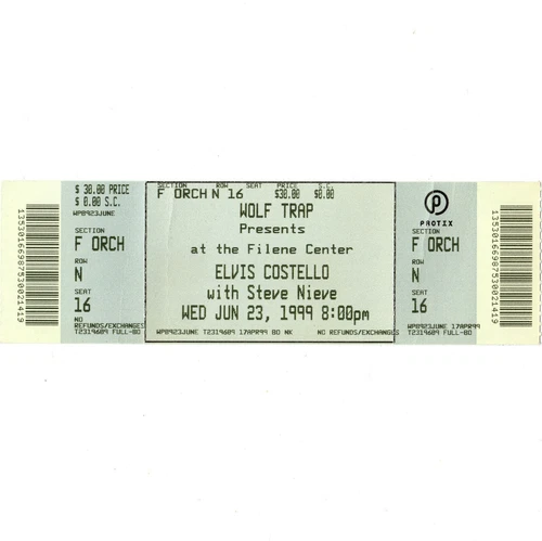 ELVIS COSTELLO & STEVE NIEVE Concert Ticket Stub VIENNA VA 6/23/99 WOLF TRAP HTF
