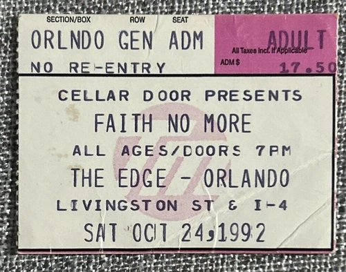 Vintage Faith No More Angel Dust Tour Ticket Stub The Edge Orlando 10/24/92