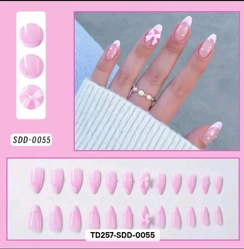 Pink French Tip Press On Nails 3D Bow Almond Full Cover SDD-0055