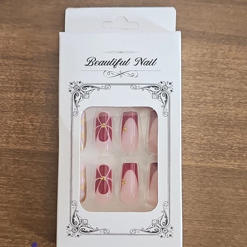 Beautiful Nail Pink Burgundy 3D Flower Press-On Nails Gold Square Full Cover