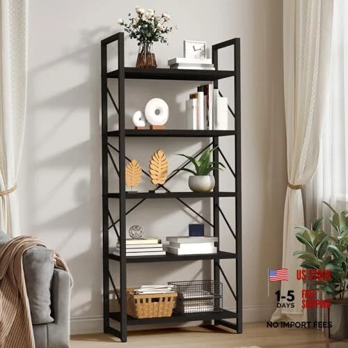 5 Tiers Bookshelf, Artsy Modern Bookcase, Book Rack, 23.6"W x 62.2"H Black