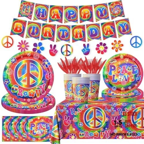 Tie Dye Birthday Party Supplies, 60's Hippie Theme Tableware Set Include