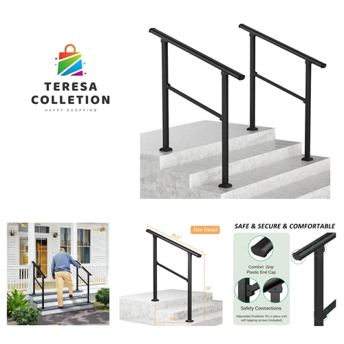 Handrails for Outdoor Steps, Black Wrought Iron Handrail Fits 3 or 4 Steps, T...